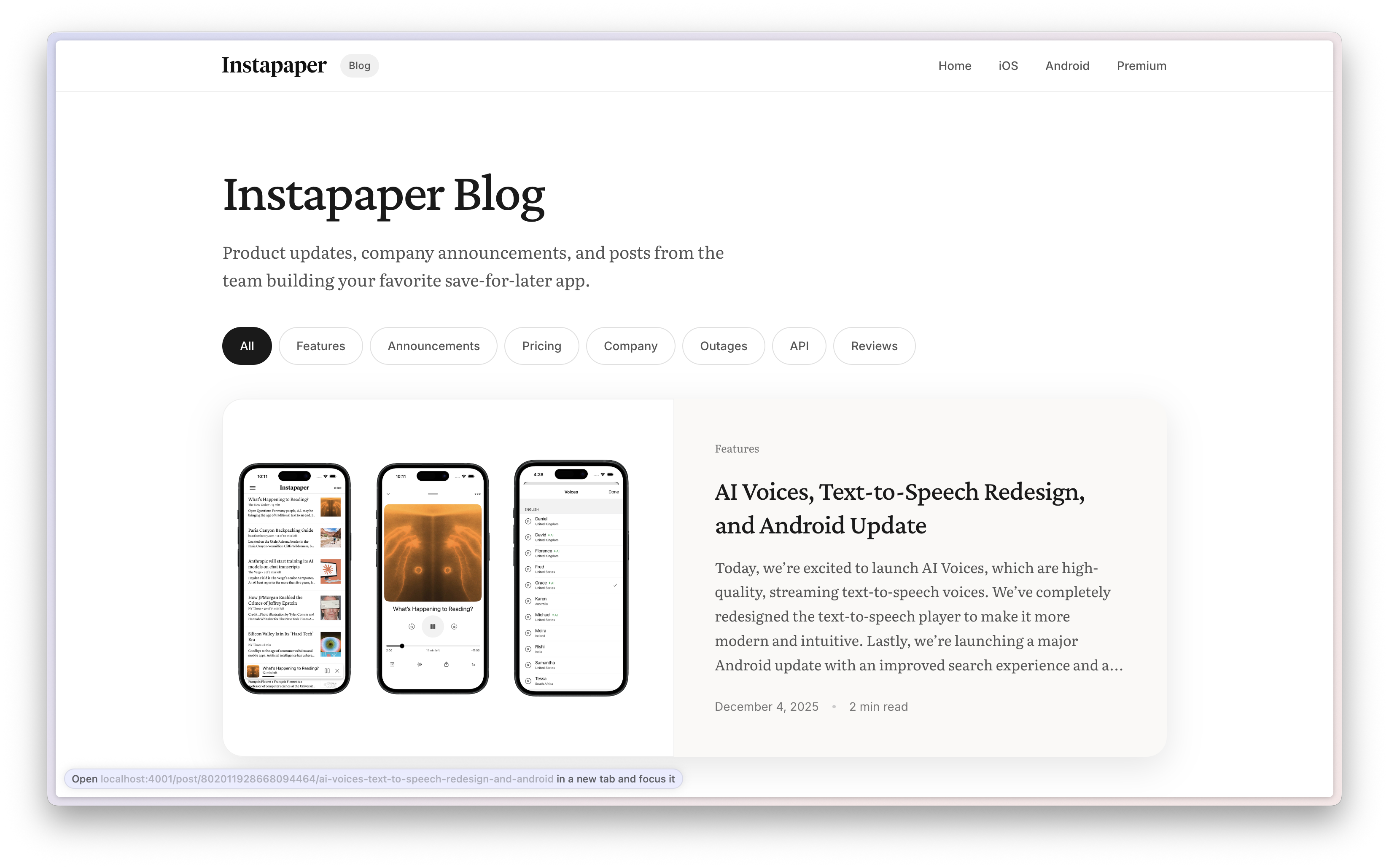 For several years now I’ve been really embarrassed about the state of Instapaper’s blog. It’s been simultaneously the lowest quality part of of our web presence, and also the place where we made our most important announcements. I had dreaded the idea of spending a lot of time migrating and modernizing it.