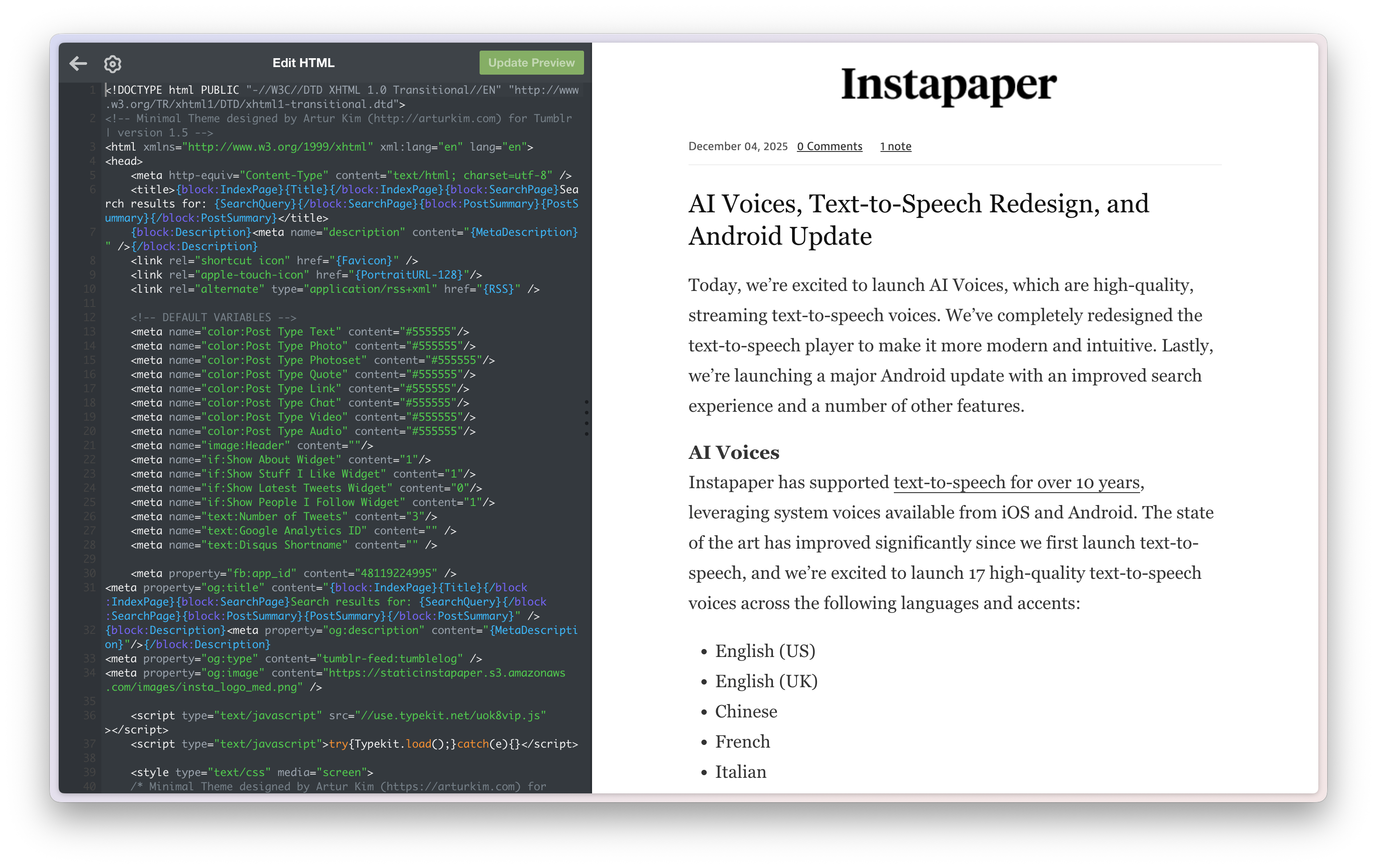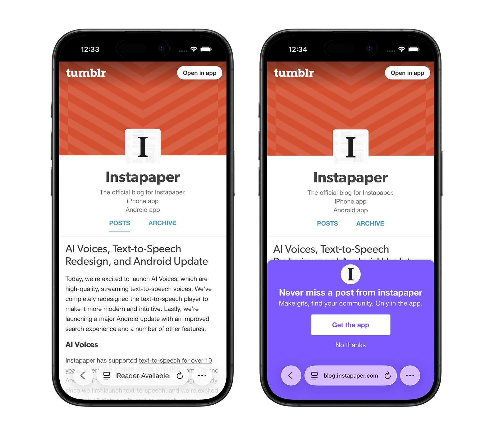 - Mobile Theme Overrides: For a while now, Tumblr has been overriding custom themes on mobile devices, forcing Tumblr-specific theming that doesn’t match the desktop experience. This created a strange and inconsistent experience for our blog, especially where Tumblr is trying to market their own product on the blog where we’re marketing Instapaper.