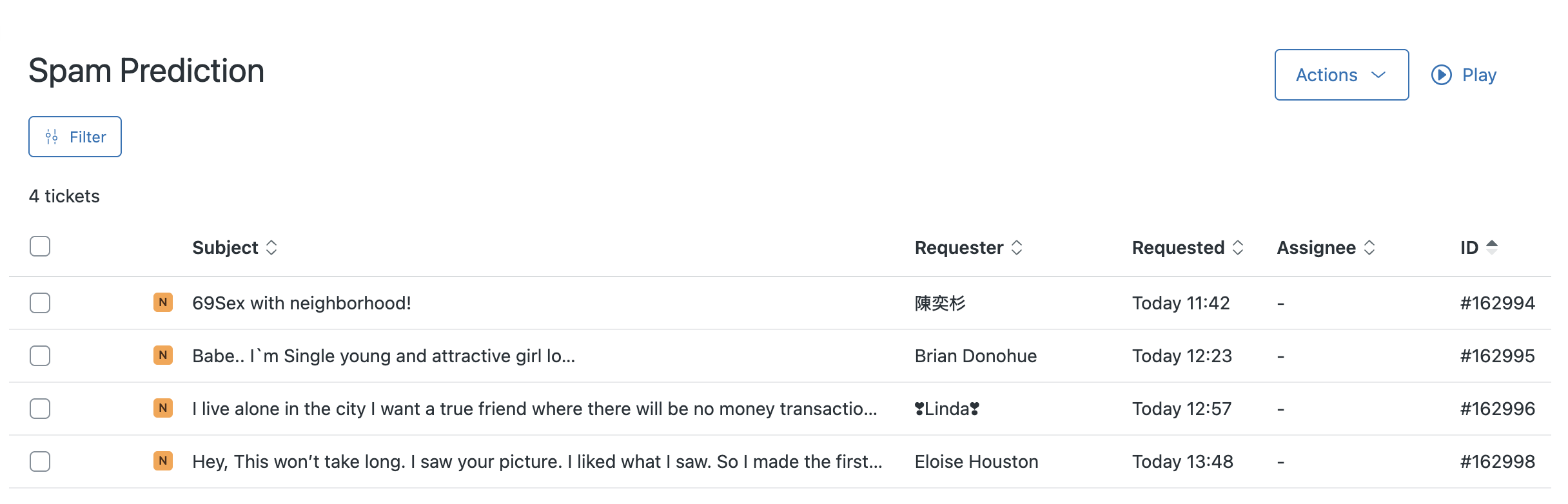 The last step was to extend the Zendesk webhook to check for spam only if the sender is not an Instapaper user. If the message is predicted to be spam, the ticket gets a “spam” tag added to it, and it’s moved from the main ticket queue to a “Spam Predicted” ticket queue. That queue gets reviewed by a human for false positives, and can then be dealt with in bulk without polluting the main support queue: